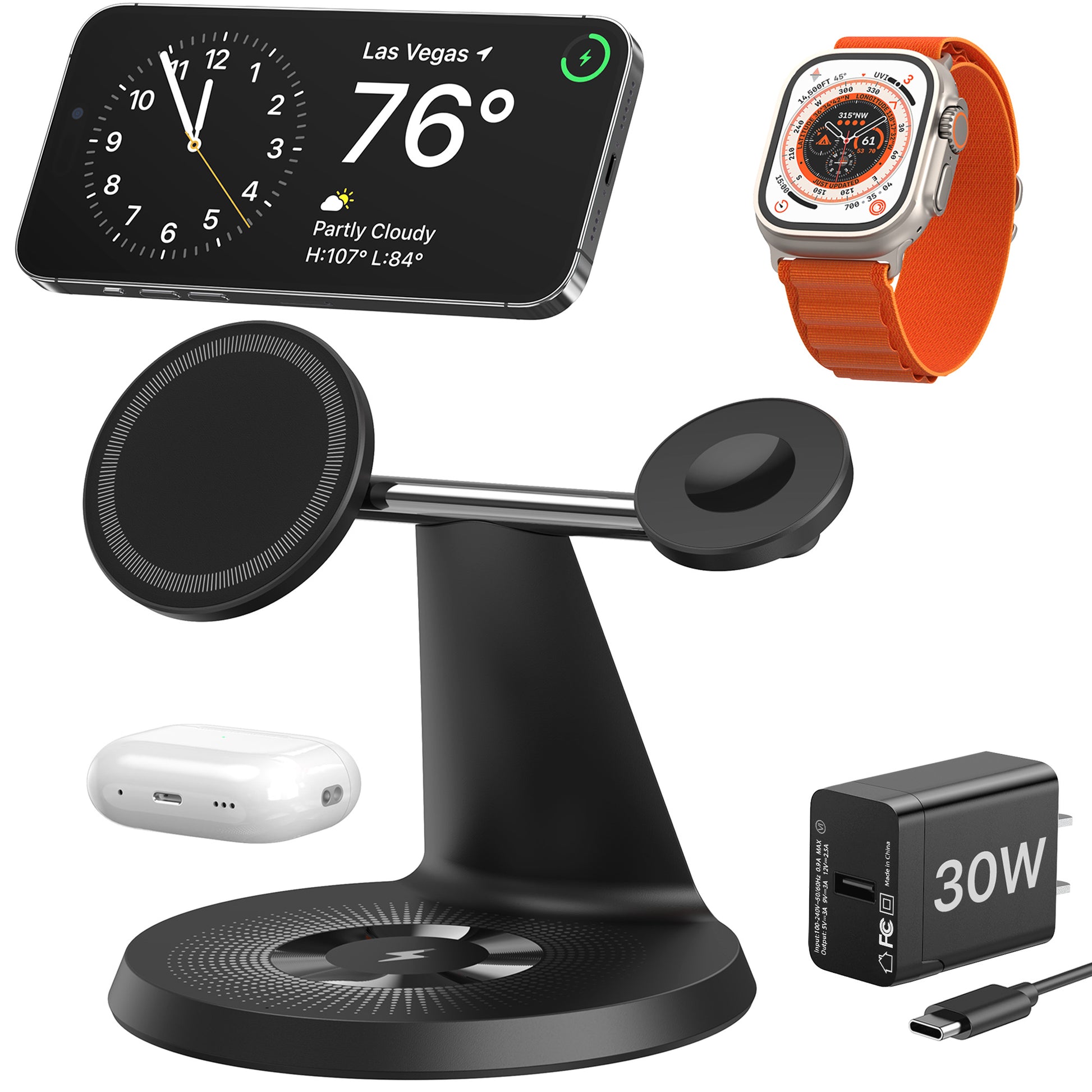 - 3 in 1 Charging Station with a 30W Adapter: As an all-in-one mag-safe charger stand, we want it to maximize the power of all 3 devices when the charging station charges them at the same time. So we included a 30W QC 3.0 power adapter and a USB-C cable with our fast charging station to perfectly supply the current that supports fast charging of 3 devices. It will help save you the cost of an extra adapter while allowing you to charge your devices right out of the box.